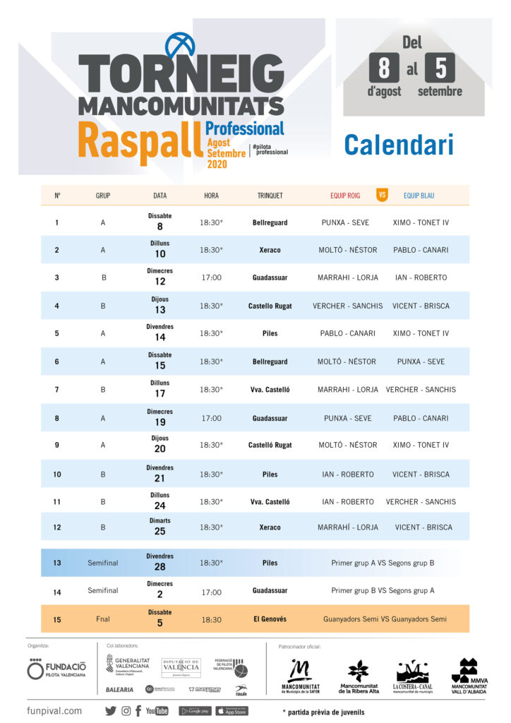 El sistema de competició serà de lliga de tots contra tots amb un total de 6 partides i els dos millors equips es classificaran per a la final que també es disputarà el 5 de setembre al trinquet del Genovés. El calendari i les seus de les partides es podran consultar des de demà dimarts al web de la Fundació (www.funpival.com)