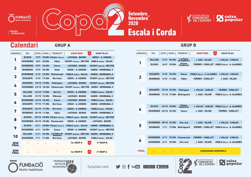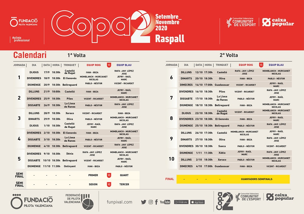 En la Copa 2 Comunitat de l’Esport – Caixa Popular de raspall s’han configurat sis equips que competiran en un únic grup. La relació de participants és la següent: Iván i Ibiza; Rafa, Javi López i José; Pablo i Néstor; Momblanch, Murcianet i Nico; Jeffry, Raúl i Marc; Vicent i Ricardet.