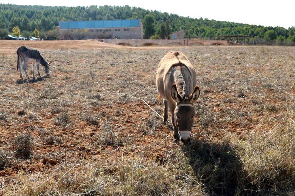 A los pies del poblado, en sus estribaciones, una pequeña señal pegada al arcén nos advierte de que debemos cruzar porque hemos arrivado a la finca de la bodega. Hemos llegado a nuestro primer destino. Se extienden los viñedos, y mientras atravesamos la carretera de tierra que nos lleva a las intalaciones de Celler de Roure, tres simpáticos asnos levantan la mirada al advertir nuestra presencia.