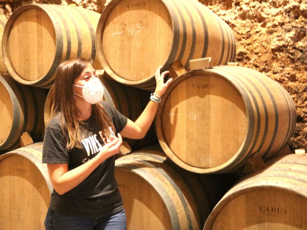 Natalia nos guía por las bodegas, esta vez ante las barricas de «Les Alcusses» y «Maduresa»/ Fotos: @siskoestelles
