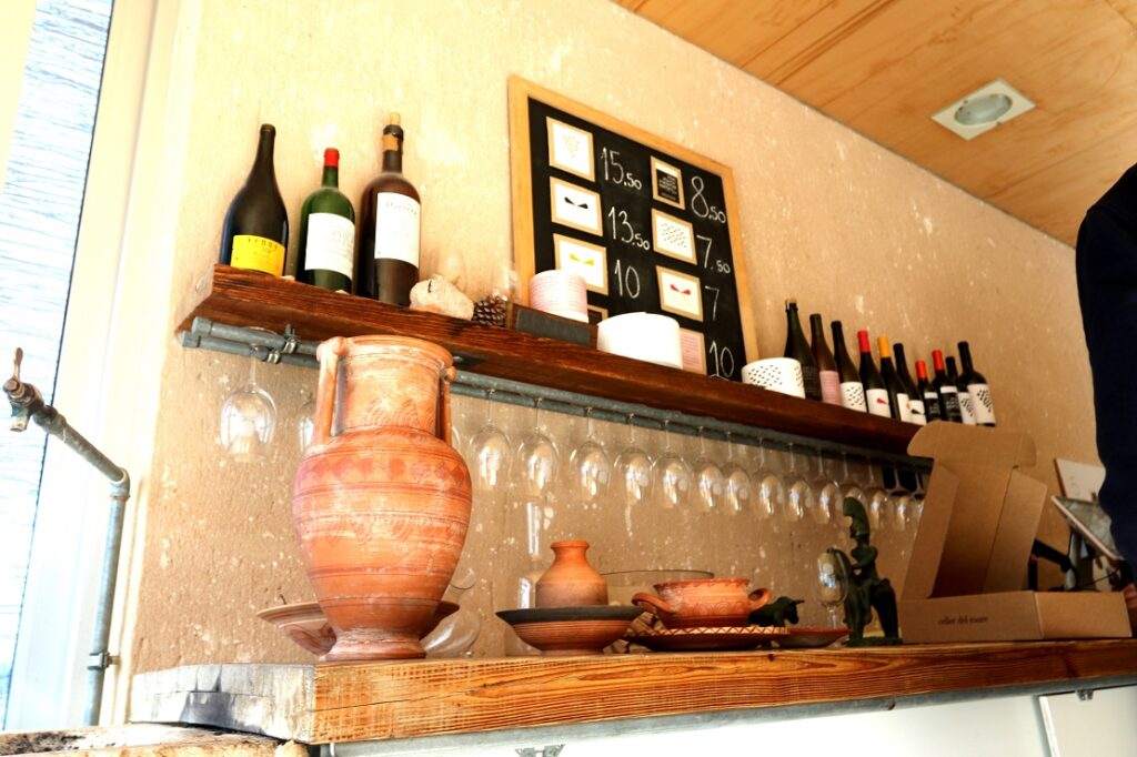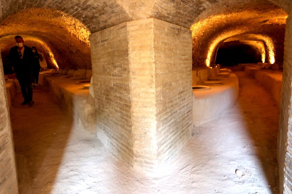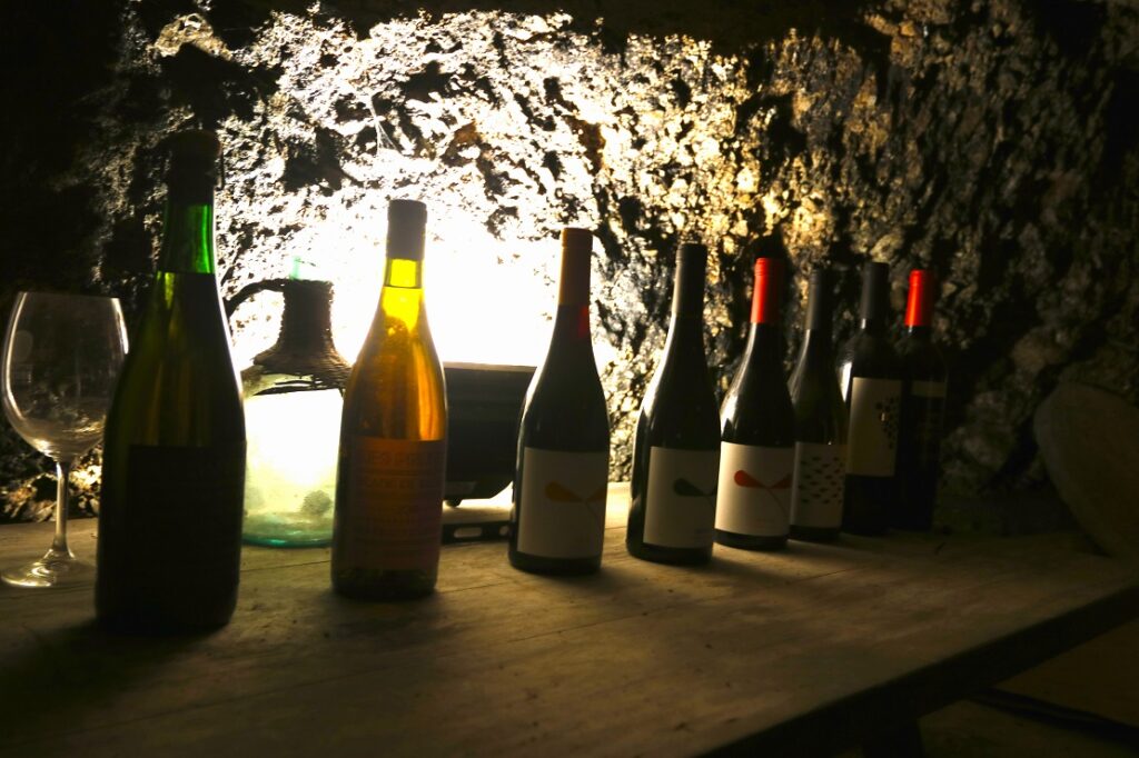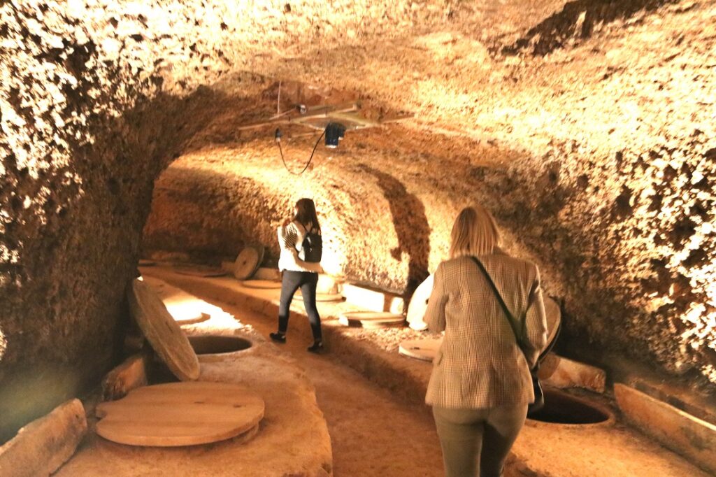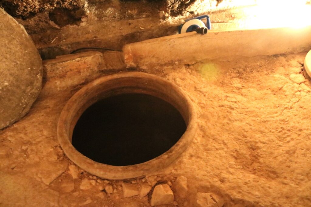 Natalia nos conduce a La Bodega Fonda, una construcción que han recuperado la familia Calatayud, y que data del siglo XVII. Una angosta, pero bonita escalera de piedra es el acceso a las bodegas. Remozadas en forma circular, la entrada y la salida confluyen en un punto común de una estructura con forma de U invertida. Entramos por la parte derecha y empezamos el recorrido bajo tierra, donde las enormes tinas de barro están soterradas en la estructura excavada en la piedra. Son más de 2.000 litros, en total, los que se almacenan en estas gigantescas tinajas soterradas.