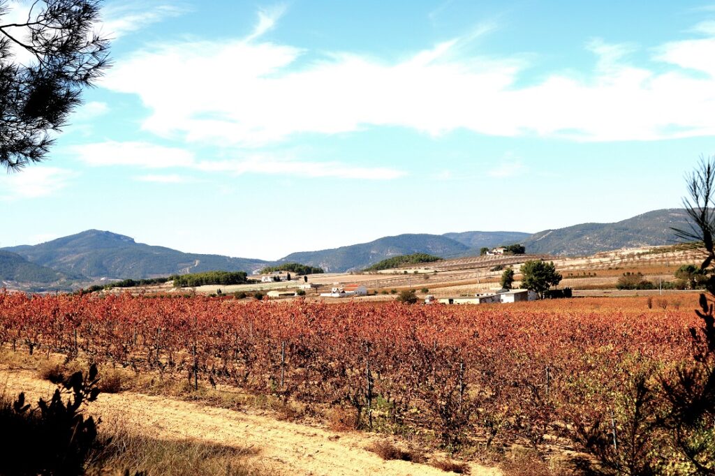 Los cultivos de secano se abren paso al margen izquierdo del valle. Hoy son tierras áridas y arenosas tras la vendimia. Cepas limpias, viñedos de color granate, amarillo pajizo, y una tierra seca en un otoño en el que apenas ha llovido. Sin embargo, después de una primavera lluviosa y un verano caluroso, la vendimia ha sido excelente. La producción de vino ha sido óptima. Puede ser un buen año para las bodegas de les ‘Terres dels Alforins’.