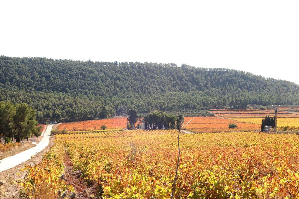 La mañana es soleada y cálida. Con dieciséis grados de temperatura y un sol radiante, la carretera comarcal que une los pueblos de Moixent, Fontanars dels Alforins y La Font de la Figuera es un auténtico espectáculo de colores, de terruños color ocre, y de rojos otoñales de unas vides que jalonan los once kilómetros que separan el municipio de La Costera y las bodegas. Aquí, en pocos kilómetros, conviven, “Casa Los Frailes”, “Bodega Daniel Belda”, “Rafael Cambra”, “Los Olivos”, “Bodegas Arraez”, “Bodega el Poblet”, o “Pago Casa Gran”, entre otras.