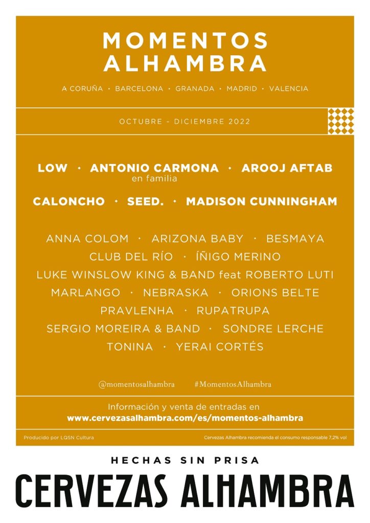 Tras el éxito de ediciones pasadas vuelve el ciclo Momentos Alhambra de otoño con un cartel más internacional en una clara apuesta por ofrecer lo más selecto de la escena musical. Algunos de los talentos que encabezan los principales circuitos de música del mundo conformarán este programa ecléctico y rico en diversidad cultural. Una programación para disfrutar en varias de las salas de referencia de todo el territorio nacional gracias a la sensibilidad y la pasión por descubrir la excelencia artística que son señas de identidad en Cervezas Alhambra.
