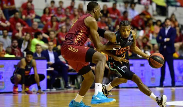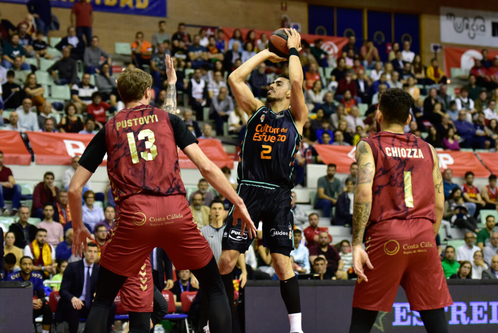 El equipo taronja equilibró con el rebote ofensivo el buen inicio en el acierto exterior del cuadro universitario en el primer cuarto y se repuso a la aparición de McFadden (que llevó a los murcianos a meter ocho de sus primeros once triples) con una mejora defensiva en los últimos minutos del segundo acto y la entrada de Hermannsson para llegar uno abajo al descanso.