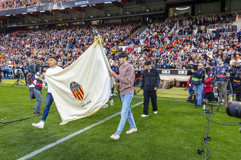 Rubén Iranzo y Javi Guerra -nacidos en los años de la generación del Triplete-, acompañados de José Luis Gayà y Fran Pérez fueron los encargados de alzar en el terreno de juego la bandera fundacional de la entidad valencianista. De esta manera y con el pitido del prestigioso exárbitro internacional Mateu Lahoz, se daba comienzo a este encuentro tan especial.