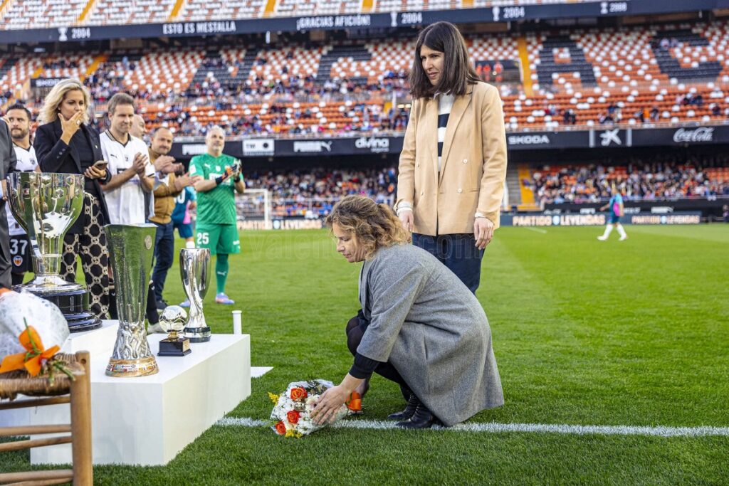 El Club homenajeó a Bernardo España ‘Españeta’-mítico utillero del Club durante más de 40 años- y a Jaume Ortí –expresidente del Valencia CF (desde la 2001-02 hasta la 2004-05). Dos personas incumbentes para el valencianismo y la entidad. Previamente al inicio del partido, familiares de ‘Españeta’ y de Jaume Ortí depositaron un ramo de flores en la silla donde acostumbraba sentarse Bernardo y junto a los trofeos conquistados, ganados durante la etapa de presidencia de Jaume Ortí.