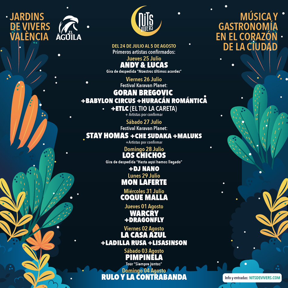 Entre el 25 de julio y el 4 de agosto, el pulmón verde de la ciudad de Valencia, los Jardines de Viveros, se llenarán de variada música en directo con Nits de Vivers; una propuesta de ocio para las noches de verano, al aire libre, en un entorno privilegiado y que se completará con una variada oferta gastronómica para disfrutar de este espacio en las noches de verano