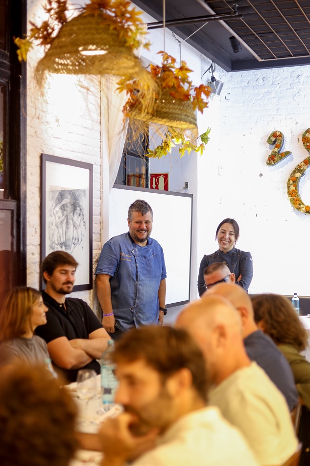 “El objetivo de esta cena es poner en valor vuestro trabajo diario, porque sin él, nada de esto sería posible”, eran las palabras con las que Alberto Alonso y Mar Soler, chefs y propietarios de 2 Estaciones, arrancaban una velada única y poco habitual en los restaurantes. Durante la noche del martes, los comensales del establecimiento de Ruzafa no fueron los de siempre, sino aquellas personas que con su labor diaria hacen posible los menús de la casa. Se trató de un homenaje para una docena de agricultores, artesanos y comerciantes con los que Mar y Alberto trabajan a diario, a fin de resaltar “su imprescindible labor”, pero también para ayudar a “mantener la ilusión”, tan necesaria en estos oficios. Todo ello, rodeado de un coloquio grupal, que moderaron las periodistas Marta Pascual (À Punt) y Ana Climent (Ca Climent), en relación con la situación del sector agroalimentario y la pérdida progresiva de los oficios.