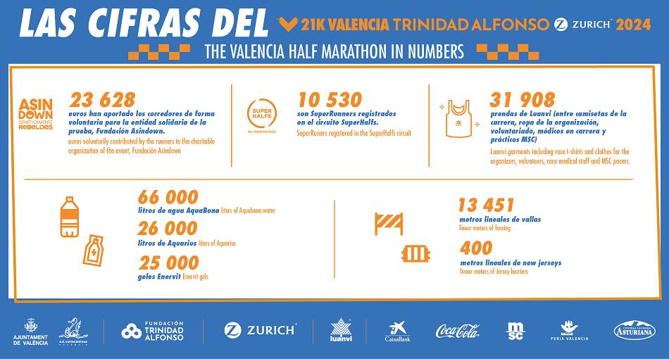 El Medio Maratón Valencia Trinidad Alfonso Zurich acogerá el próximo 27 de octubre a 25 000 corredores inscritos, 3000 más que en 2023, con el objetivo de lograr realizar su mejor “vuelo”, pero esta no será la única gran cifra del evento. A continuación destacamos algunas de ellas: