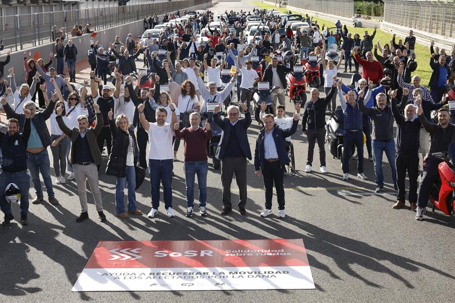 El acto, realizado en el circuito Ricardo Tormo de Cheste, donde los coches y las motos se amontonaban en la recta de meta, ha contado con Carlos Sainz y Jorge Martínez ‘Aspar’, dos leyendas del motor español, y supone el pistoletazo de salida de una asociación creada expresamente para ayudar a los centenares de miles afectados por la dana.