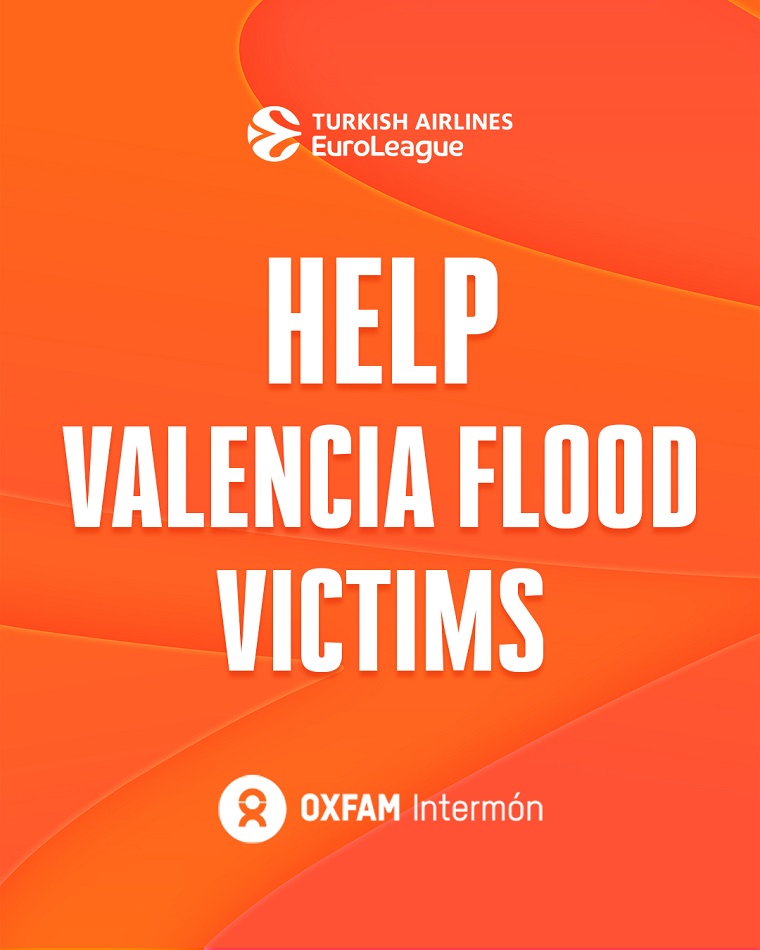 «Dona ahora para apoyar a los afectados en Valencia tras las devastadoras inundaciones. La Euroliga quiere animar a las personas a apoyar a los habitantes de la Comunidad Valenciana y las provincias cooperando con OXFAM, una organización benéfica que ayuda a cuidar a los grupos afectados en la zona», indica el texto.