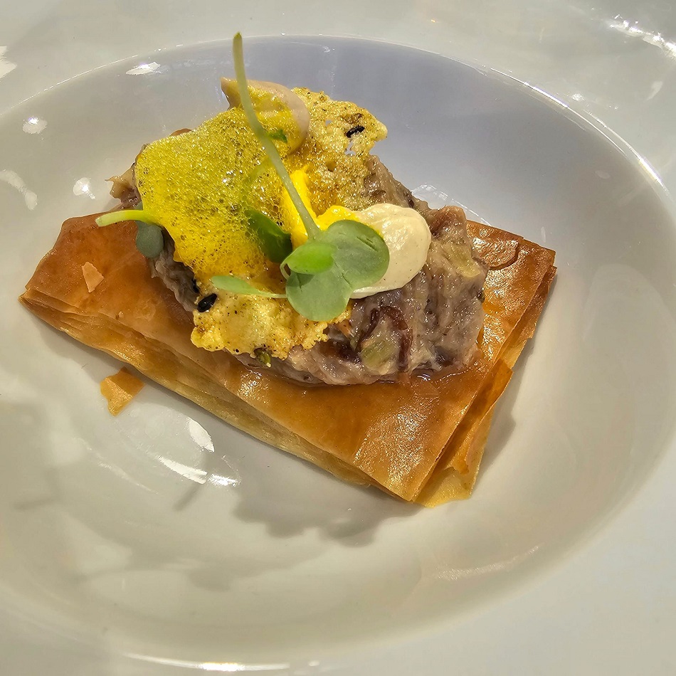 En la parte culinaria, Rafael Herreros, del Restaurante Dallas (Plaza Maestro Chueca, 13, Albacete), abrió el menú con un Croissant con ajo mortero y chipirón en tempura. Una versión del mítico atascaburras que se puede encontrar en su restaurante, donde proponen una experiencia gastronómica única en la que aúnan la cocina tradicional de su tierra con toques vanguardistas que hacen de cada visita un motivo para volver.