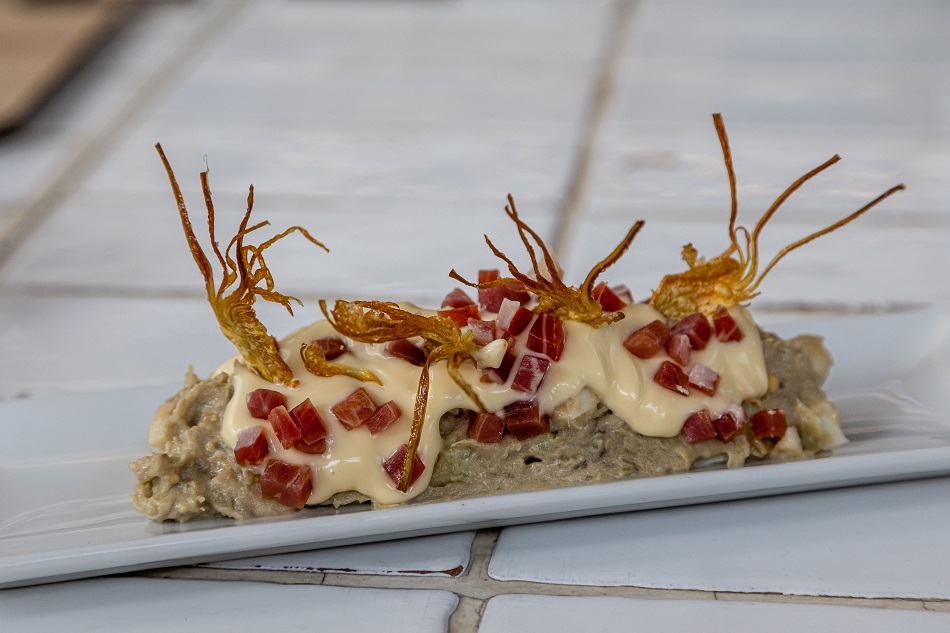 Un plato sencillo donde la estrella indiscutible es la alcachofa, un producto de temporada que aporta un sabor único y especial a esta reinterpretación de la ensaladilla clásica. En este homenaje a la huerta valenciana, la alcachofa no solo brilla como ingrediente principal, sino que también se integra en la cremosa mayonesa que la acompaña, intensificando su esencia. El toque salado y sabroso del jamón añade un contraste delicioso. La receta se corona con unas crujientes y doradas chips de alcachofa, que completan esta creación culinaria con un guiño innovador.