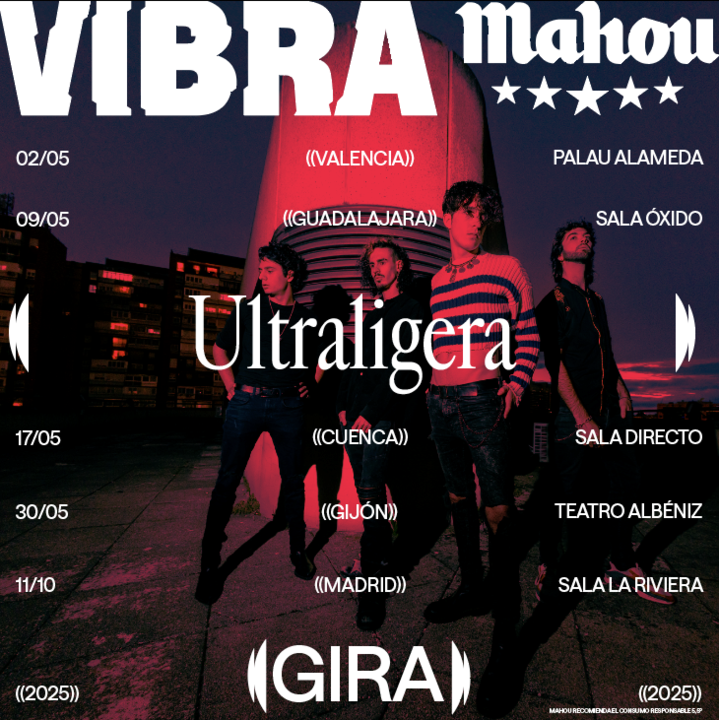 Ultraligera se suma a la historia de la Gira Vibra Mahou, una experiencia única con la que llevará su potente directo a cinco ciudades españolas. De la mano de la plataforma musical de Mahou Cinco Estrellas, que une a artistas y público en torno a la música en vivo, el nuevo fenómeno del indie rock recorrerá distintas salas del país en un tour que arrancará en mayo y se extenderá hasta octubre.
