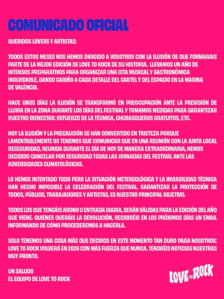 Gracias por la comprensión y esperamos veros en Love to Rock 2026.